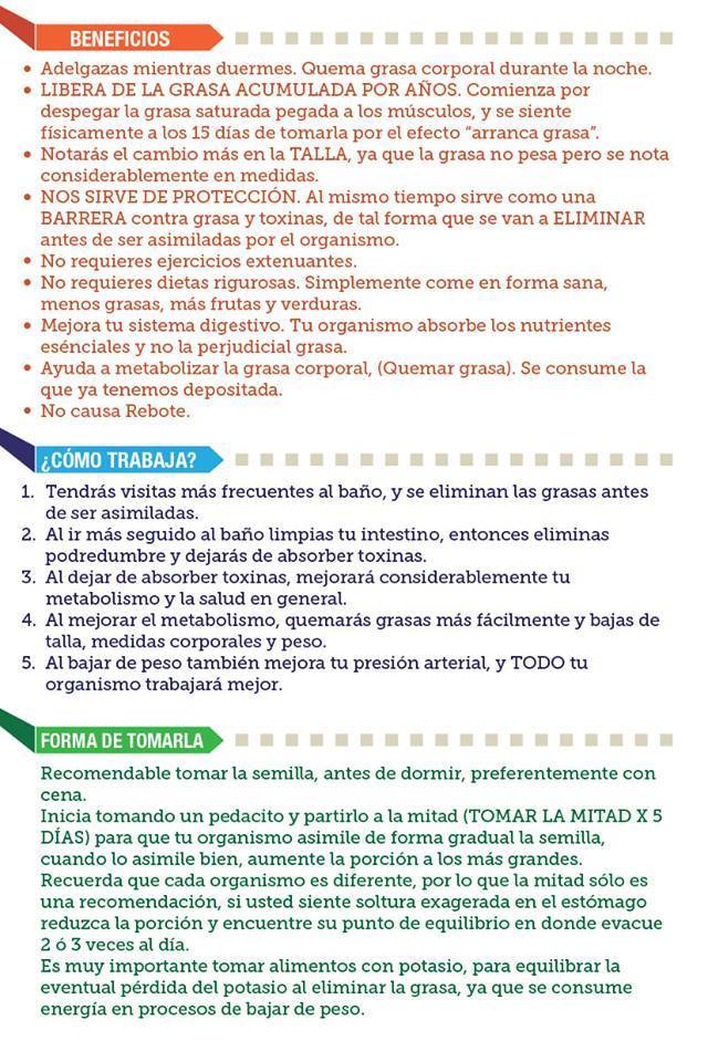 ¿Qué es lo que hace la semilla? Te ayuda a bajar en talla y peso, de manera NATURAL y sin Efectos Secundarios, te adelgaza mientras duermes, pues quema grasa corporal por las noches, libera la grasa acumulada por años, comenzando por despegar la grasa saturada pegada al músculo.